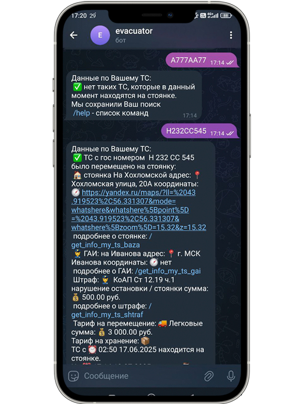Не нужно звонить или писать. Можно голосом в бот скинуть адрес и описание ТС, которое нужно эвакуировать. И система сама переведет адрес в координаты для вызова и из описания сформирует карточку ТС: ГРЗ, марка, модель, цвет и прочее.